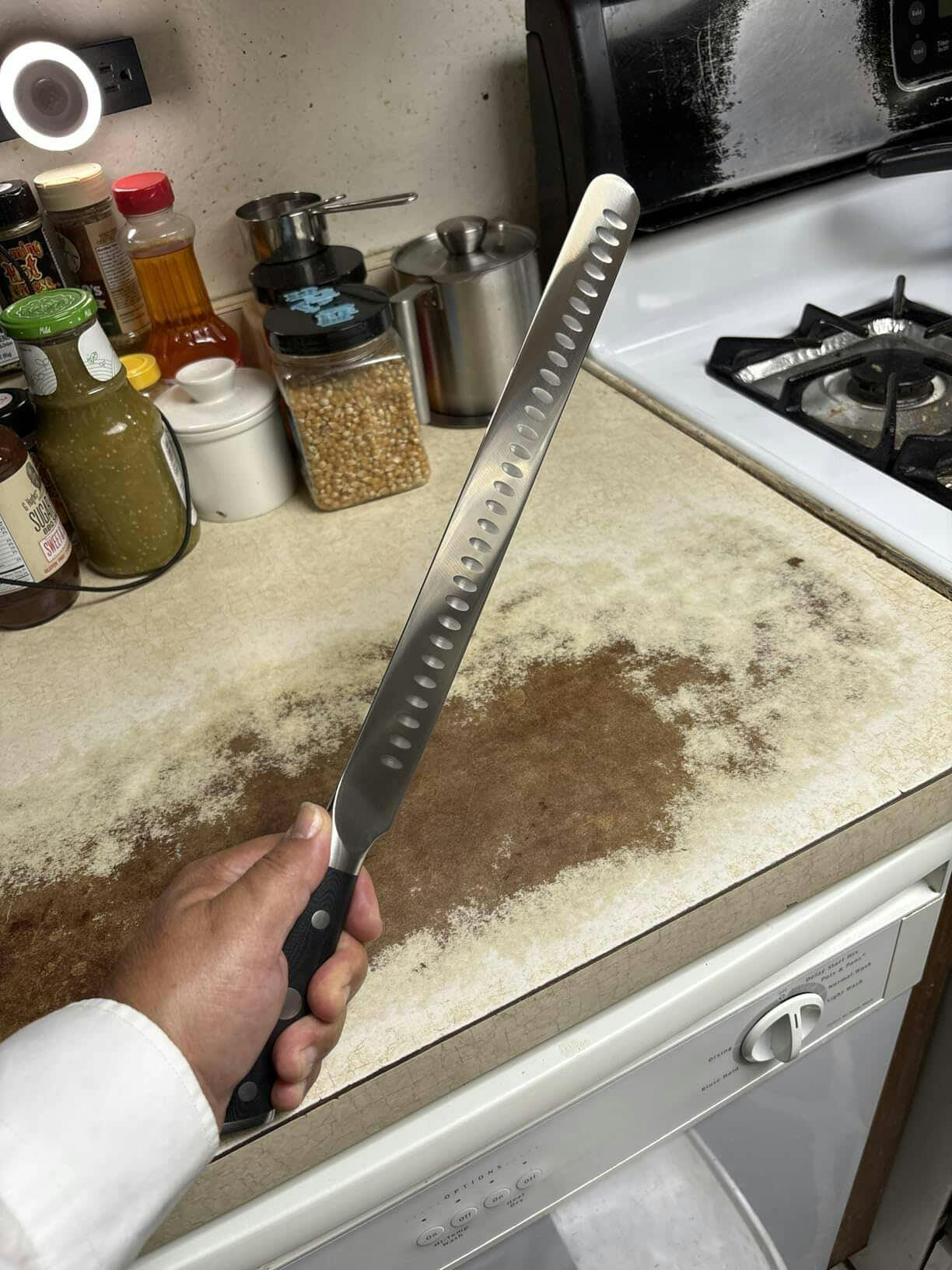 Ultra Sharp Premium 12” Fillet Knife has a long, narrow and sharp blade that engineered to achieve high-precision cutting with minimal force. This 12-inch slicing carving knife is perfect for cutting ham, grilled meat, turkey, salmon, and other large cooked meats. Full-tang design and the triple-riveted handle provides superb durability and safety.